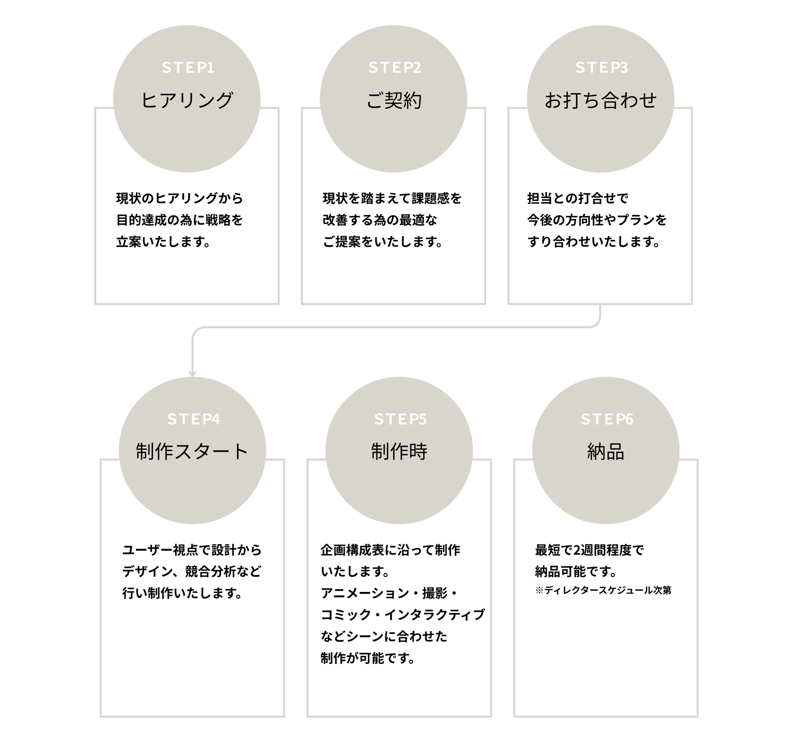 動画制作の企画、撮影、編集、納品までをワンストップで行い市場分析から戦略立案、広告運用、導入後のアフターサポートまでを一貫しております。